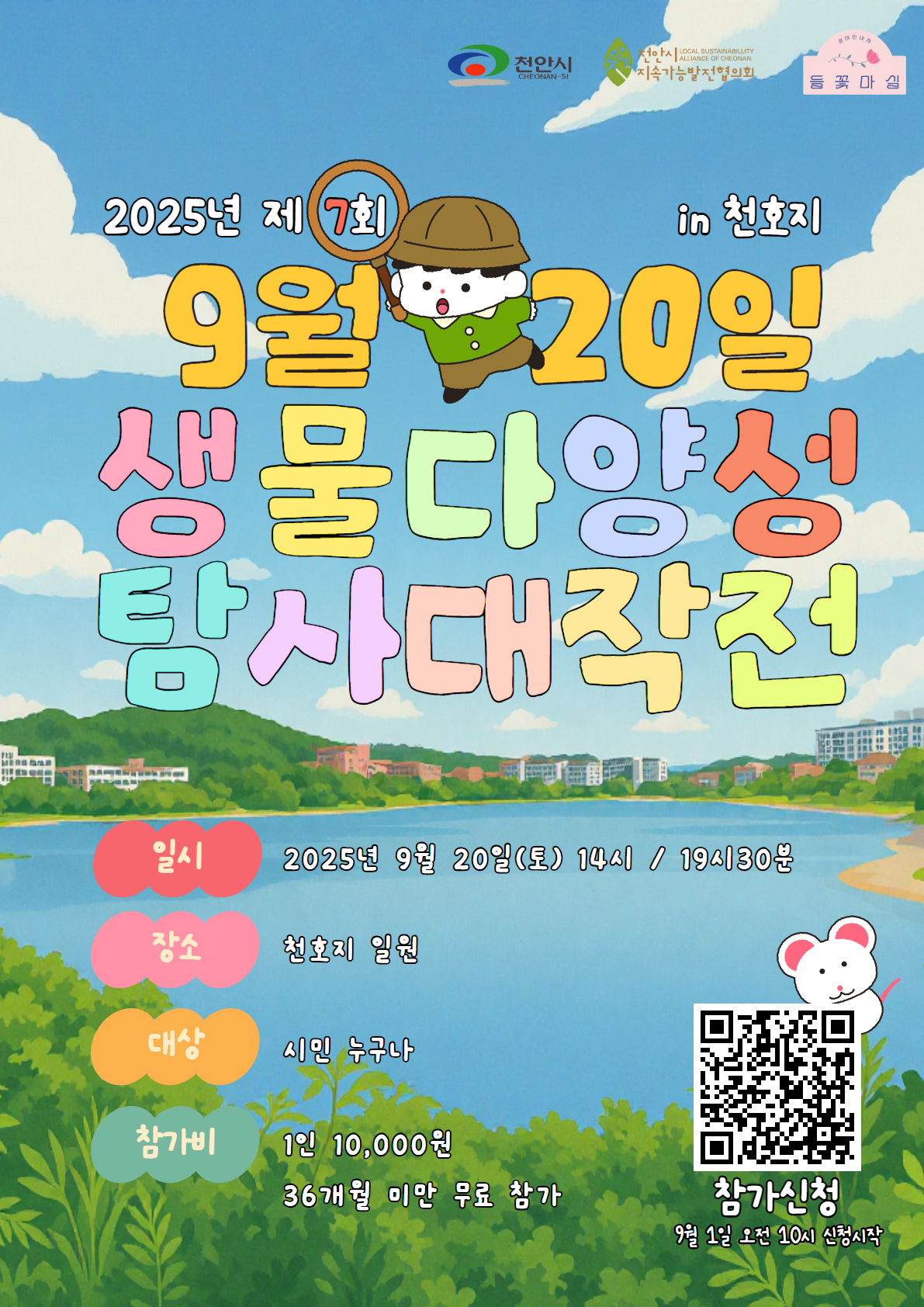 천안시지속가능발전협의회는 지속가능발전목표 중 양질의 교육(G4), 지속가능한 도시와 정주지(G11), 육상생태계보전(G15)의 중요성을 인식하고 지역사회 확산을 도모하고자합니다. 환경의날을 기념하기 위하여 전문가와 시민과학자가 함께 즐기고 생태적 감수성을 함양하기 위하여 2018년부터 생물다양성 탐사 대작전을 시민의숲과 성성호수공원에서 진행해오고 있습니다. 성성호수공원은 금개구리, 맹꽁이, 삵, 노랑부리저어새, 원앙, 참매, 황조롱이 등 멸종위기야생생물Ⅱ급과 천연기념물 등 다양한 생물이 서식하는 천혜의 습지로, 도심에 위치하고 있으며, 공원 안정화에 따른 생물종의 변화를 기록하고자 합니다. 참고로 생물다양성 탐사 대작적은 일명 바이오블리츠라 불리우며, 일정시간동간 특정 장소내 시민과학자와 전문가가 함께 서식하는 생물종을 찾아 기록하는 일종의 시민과학 프로그램입니다.